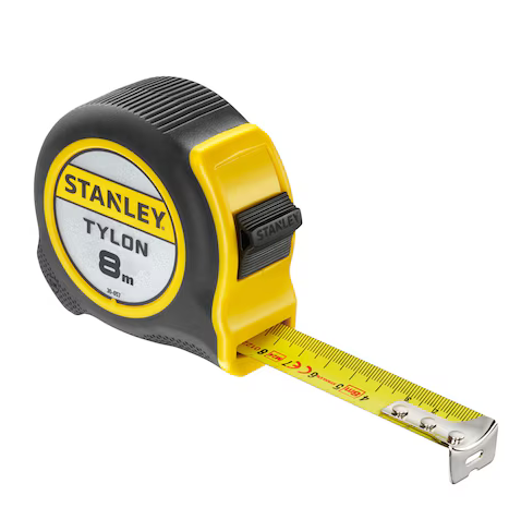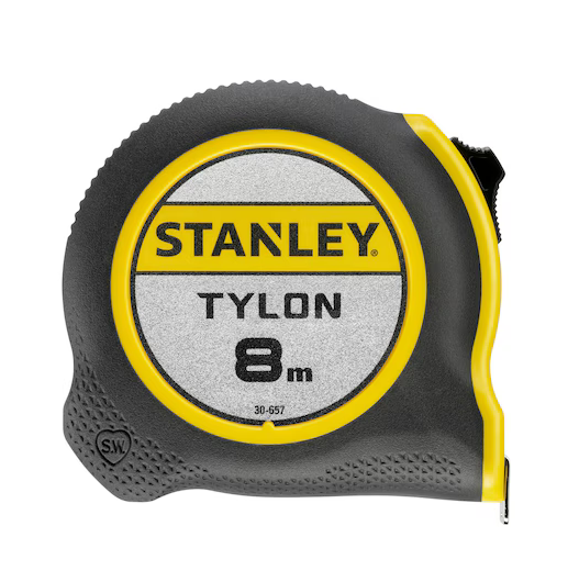 Miara zwijana 8m Stanley Tylon 0-30-657 to narzędzie do pomiaru długości do 8m. Miara Stanley została wykonana z taśmy stalowej polakierowanej i pokrytej powłoką Tylon™zamkniętej w obudowie z tworzywa sztucznego. Miara stalowa Stanley Tylon 0-30-657 posiada blokadę zwijania taśmy, zaczep do paska i zaczep mierniczy zamocowany za pomocą 2 nitów.