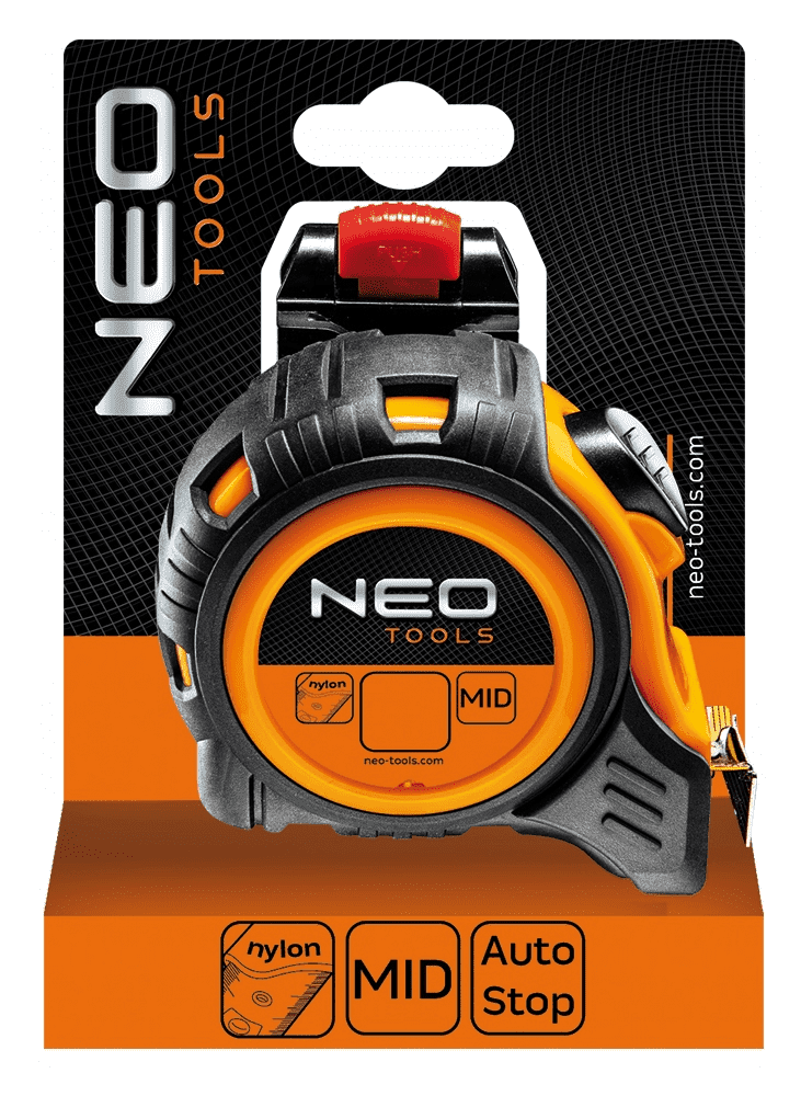 Miara zwijana stalowa NEO (nr ref. 67-205) o długości 5 m posiada automatyczną blokadę zwijania taśmy.