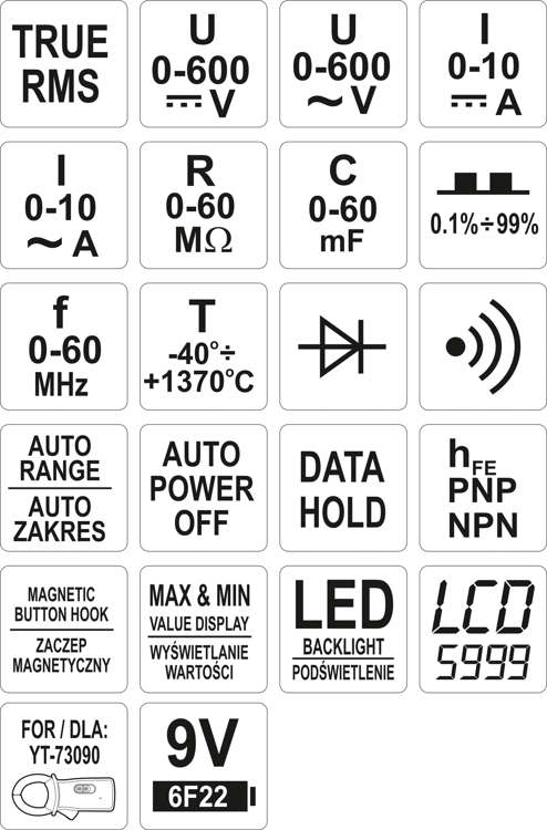 Miernik uniwersalny YT-73085 z funkcją TRUE RMS oraz z automatycznym zakresem dla każdego pomiaru umożliwia wykonanie podstawowych oraz zaawansowanych pomiarów elektrycznych. Oprócz szybkości działania jego niewątpliwą zaletą jest możliwość zastosowania dodatkowego akcesorium w postaci cęg pomiarowych np. YT-73090 do wykonywania pomiarów prądów o wysokich wartościach.