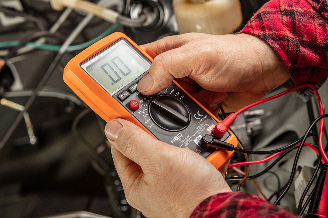 Miernik elektroniczny uniwersalny NEO (nr ref. 94-001) służy do dokonania pomiarów napięcia prądu stałego i przemiennego, natężenia prądu przemiennego i stałego, oporności elektrycznej, sprawdzenia ciągłości przewodów, hFE (tester tranzystorów), pojemności, pomiaru diody oraz temperatury. Posiada automatyczne zakresy pomiarowe oraz pamięć ostatnich pomiarów. Korpus wykonany z wysokiej jakości tworzywa sztucznego. Podświetlany wyświetlacz LCD umożliwia pracę przy słabym oświetleniu. Nylonowy pokrowiec ułatwia przechowywanie i transport. Zgodność z europejskimi standardami bezpieczeństwa zapewnia certyfikat CE. Marka NEO spełnia oczekiwania profesjonalistów