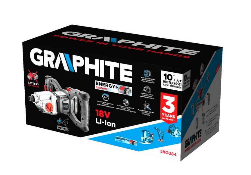 Mieszarka akumulatorowa Graphite 58G084 Energy+ to narzędzie, które łączy wydajność z mobilnością, zapewniając możliwość wykonywania prac mieszania w różnych miejscach, bez konieczności dostępu do prądu elektrycznego.