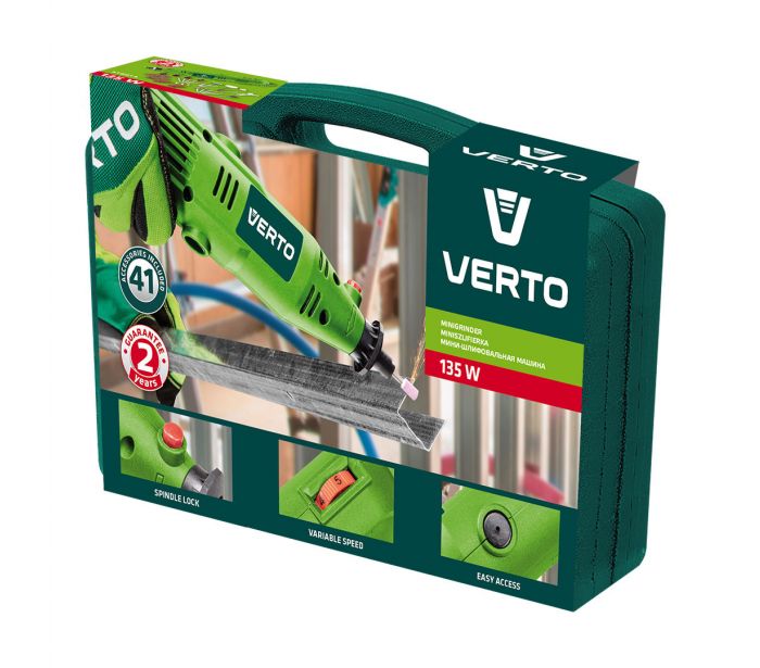 Miniszlifierka 135 W Verto (nr. Ref. 51G014) to funkcjonalna i poręczna miniszlifierka o szerokim zastosowaniu. Umożliwia cięcie, szlifowanie, polerowanie a także wiercenie w różnych materiałach. Posiada lekką i ergonomiczną obudowę oraz wydajny silnik o mocy 135 W umożliwiający wykonywanie większości prac warsztatowych. Miniszlifierka wyposażona jest w płynną regulację obrotów w zakresie 10000 do 35000 obr./min. Dostarczana w praktycznej walizce z tworzywa sztucznego wraz z bogatym zestawem akcesoriów, takich jak kamienie szlifierskie, frezy diamentowe, wiertła, osełka, filce polerskie, głowica i taśmy do szlifowania oraz tarcze tnące. Zgodność z europejskimi standardami bezpieczeństwa zapewnia certyfikat CE. Marka VERTO oferuje asortyment elektronarzędzi i akcesoriów dla każdego majsterkowicza.