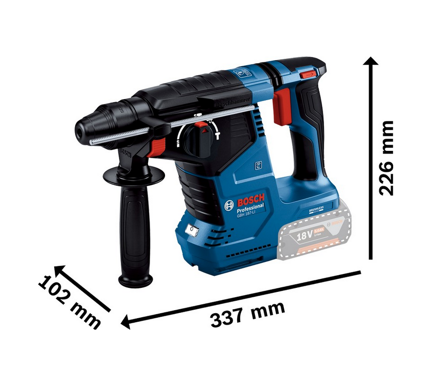 Młotowiertarka akumulatorowa Bosch GBH 187-LI 0611923020 to narzędzie, które wyróżnia się wydajnością i szybkością wykonywania otworów, a jednocześnie zapewnia wyższy standard ochrony oraz komfort użytkowania. Oto główne cechy tego narzędzia: