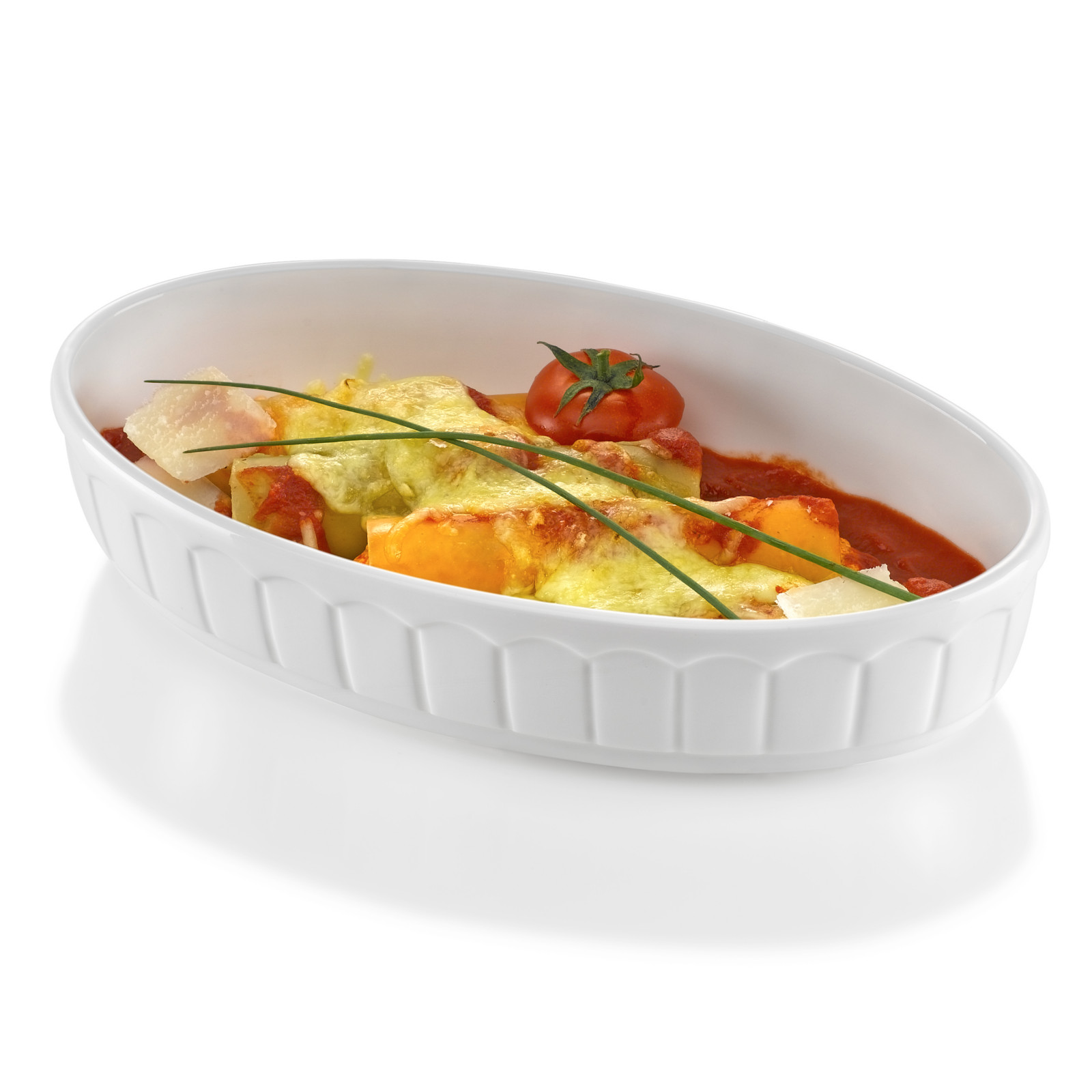 Cechy produktu:– Biała błyszcząca,– Wysoka odporność na oddziaływania fizyczne i niewielka waga,– Można używać w kuchenkach mikrofalowych,– Można używać w piecach,– Można myć w zmywarkach