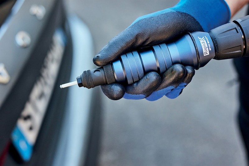 Nakładka RP150 Multi to wydajna i mocna alternatywa dla bardziej złożonych narzędzi do nitowania. Narzędzie działa jak adapter i jest mocowane do wiertarko-wkrętarki lub wkrętarki w taki sam sposób, jak zwykły bit. Dzięki temu możesz pracować wydajniej przy większych naprawach i powtarzalnych pracach blacharskich.