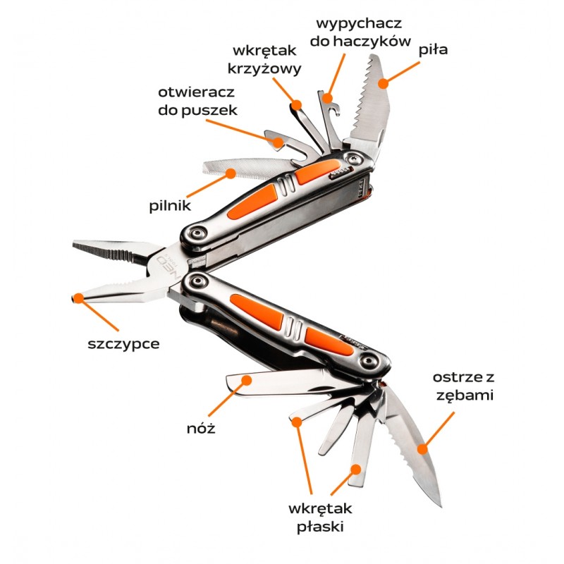 Narzędzie wielofunkcyjne NEO (nr ref. 01-028) to innowacyjne rozwiązanie. W jednym narzędziu znajduje się 11 różnych funkcji, m.in. otwieracz do puszek i butelek oraz ostry nóż niezbędny w wielu sytuacjach. Amatorzy wędkarstwa znajdą w zestawie wypychacz do haczyków