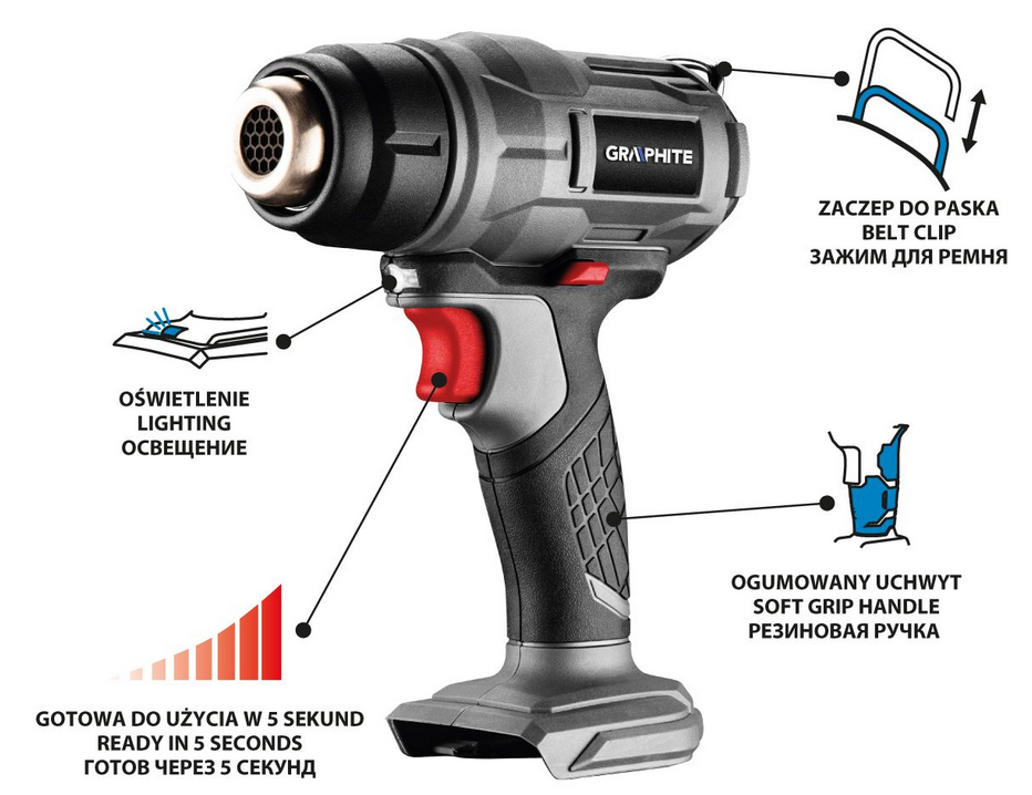 Ryobi opalarka R18HG-0 charakteryzuje się szybkim nagrzewaniem, osiągając temperaturę do 470 °C już w zaledwie 60 sekund. To oznacza, że użytkownik może natychmiast przystąpić do pracy, bez konieczności czekania na rozgrzanie narzędzia.