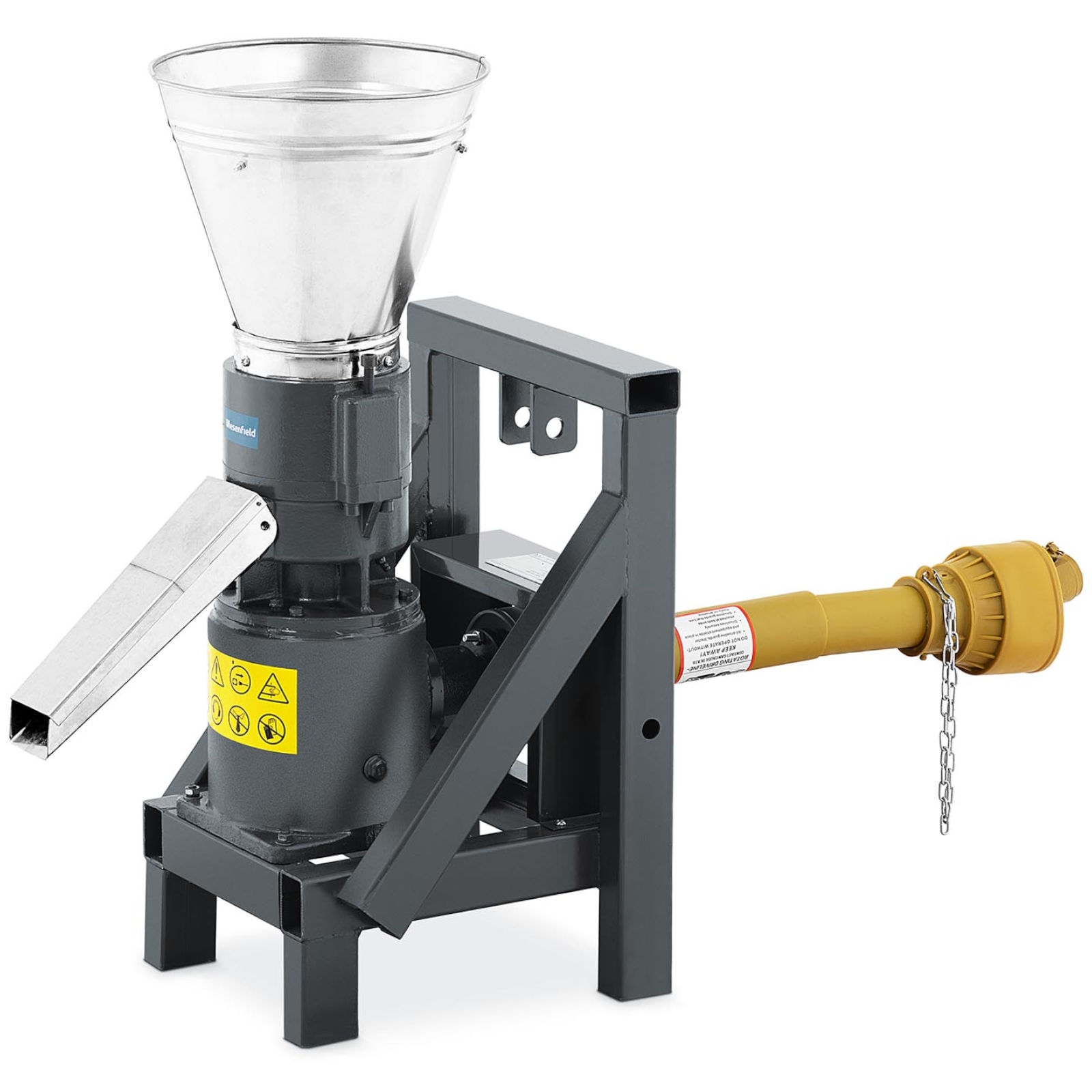 Profesjonalna peleciarka przemysłowa marki Wiesenfield służy do produkcji pelletu, paszy dla zwierząt i granulatu z różnych materiałów organicznych. Granulator daje możliwość wykorzystania drewnianych trocin, słomy, łupin orzechów, łusek ryżowych czy papieru. Są one umieszczane w specjalnej matrycy z otworami o średnicy 6 mm, gdzie poddaje się je działaniu wysokiego ciśnienia i temperatury (60-80C). Część materiałów wymaga użycia specjalnych spoiw. Peleciarka jest w stanie wytworzyć 90-120 kg paszy oraz 50-90 kg pelletu z trocin w ciągu godziny. Wydajność urządzenia została osiągnięta za sprawą zasilania wałem odbioru mocy podłączonego do ciągnika o mocy 8-12 KM.
