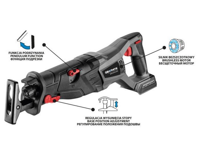 Graphite piła szablasta 58G096 posiada funkcję podrzynania oraz regulacji wysunięcia stopy, które wpływają na efektywność i skuteczność cięcia, nawet podczas pracy przy dużym obciążeniu. Dodatkowo, uchwyt brzeszczotu umożliwia szybkie przezbrojenie bez konieczności korzystania z dodatkowych narzędzi, co zwiększa wydajność pracy. Ergonomiczny uchwyt poprawia komfort użytkowania, co jest istotne przy dłuższych sesjach pracy.
