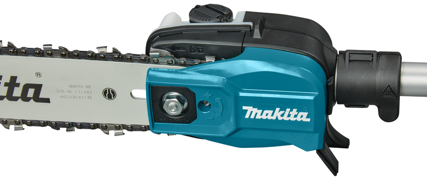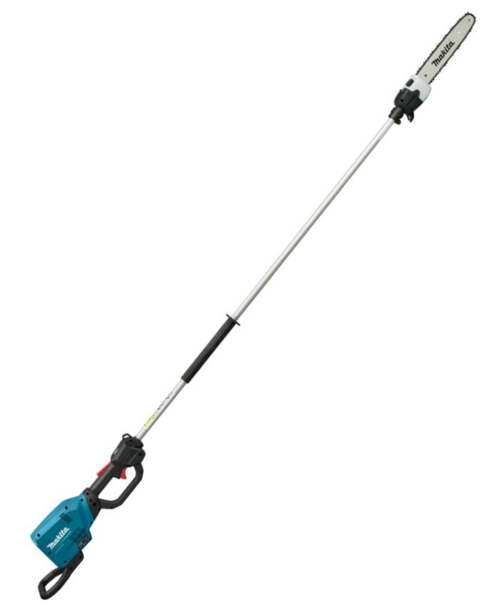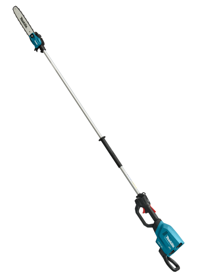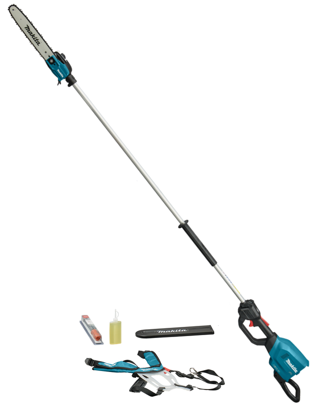 Akumulatorowa pilarka łańcuchowa z wysięgnikiem Makita DUA300Z to elektronarzędzie do cięcia i przycinania gałęzi na wysokościach. Piła DUA300Z została wyposażona w bezszczotkowy silnik zasilany 2 akumulatorami 18V Li-Ion, które dają zapas energii do realizacji wymagającego cięcia drewna i okrzesywania drzewa ze zbędnych gałęzi. Wysięgnik Makita DUA300Z o długości 250 cm pozwala prowadzić pracę na wysokościach do 4 m bez konieczności używania drabiny. Prowadnica pilarki Makita DUA300Z o długości 30 cm posiada wydajny układ smarowania łańcucha wydłużając jego żywotność, a smukła budowa głowicy ułatwiająca manewrowanie między gałęziami.
