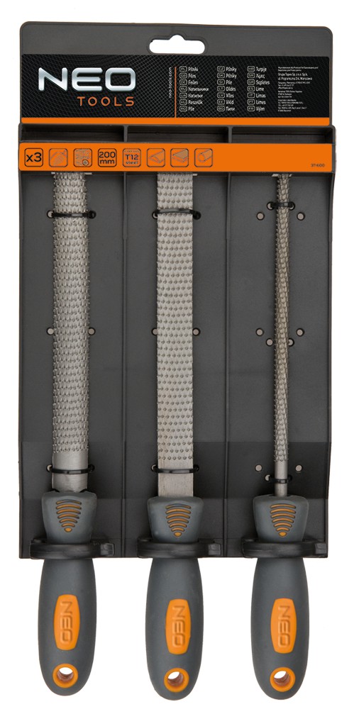 Zestaw pilników do drewna NEO zawiera 3 pilniki o długościach 200 mm każdy i przekrojach płaskim, półokrągłym i okrągłym. Przeznaczone do szlifowania drewna.