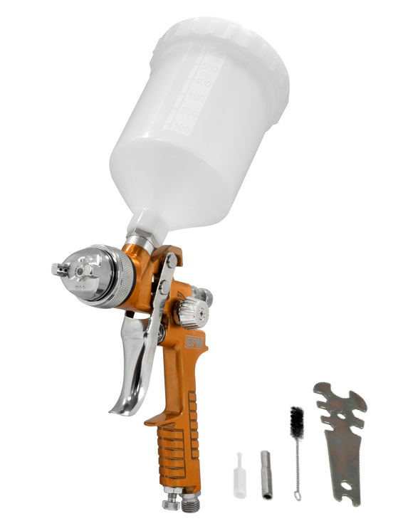 Pistolet lakierniczy EPM E-490-0201 HVLP ze zbiornikiem do narzędzie do wydajnego lakierowania. Pistolet natryskowy EPM E-490-0201 wykonany w technologii HVLP, która charakteryzuje się wysokim przepływem powietrza przy niskim jego ciśnieniu. Technologia HVLP pozwala na redukcję generowanej mgiełki lakierniczej, co zwiększa efektywność transferu (krycia) powierzchni aplikowaną farbą i ogranicza emisję lotnych związków. Pistolet do lakierowania EPM E-490-0201 został wyposażony w zbiornik o pojemności 600ml i dyszę o średnicy 1,7 mm.