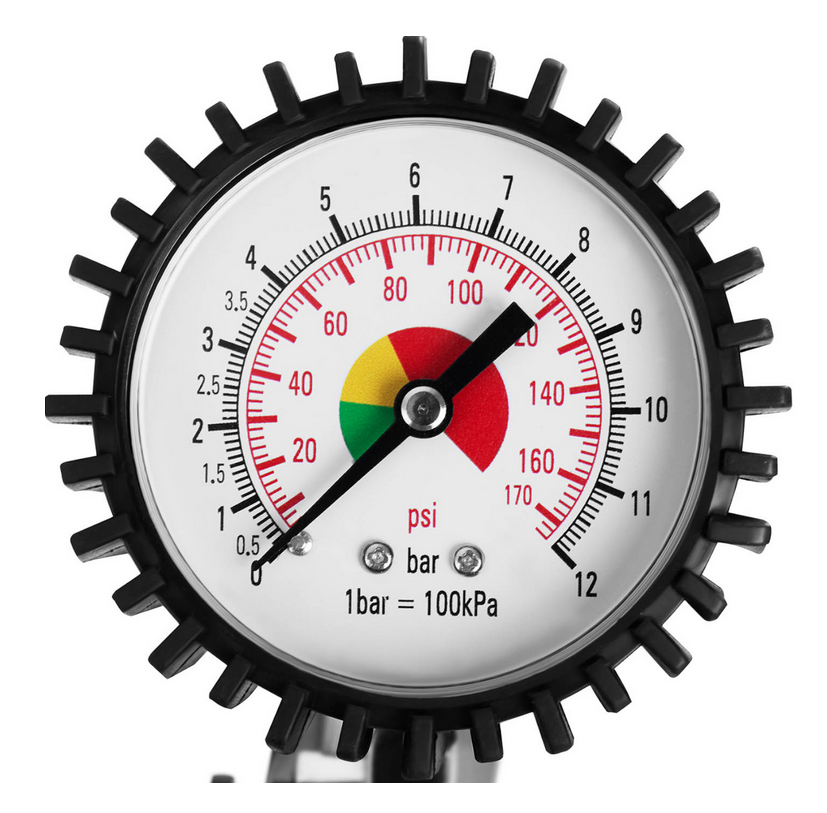 • Manometr z podwójną skalą i zakresem 0-12 bar lub 0-170 PSI