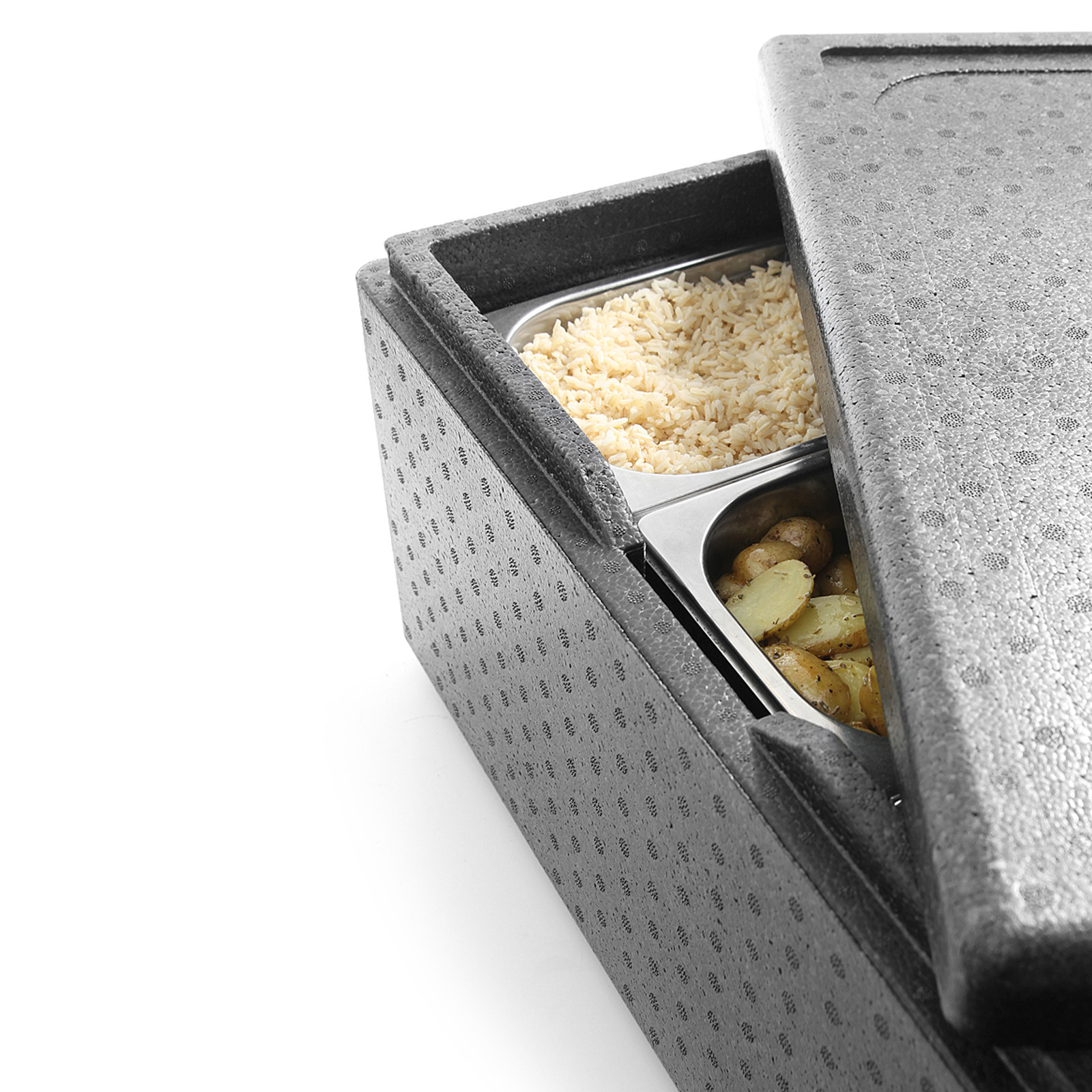 - Pojemnik termoizolacyjny GN 1/1 Hendi 46L- Wykonany z pianki polipropylenowej EEP- Korpus i pokrywa w kolorze czarnym- Posiada ergonomiczne uchwyty transportowe- Dno oraz pokrywa wyprofilowane do bezpiecznego piętrowania