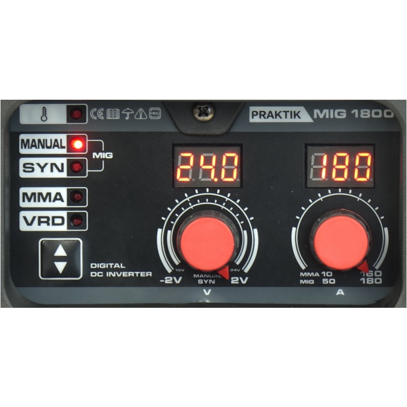 PRAKTIK MIG 1800 stosowany jest do spawania stali węglowych i niskostopowych. Spawanie odbywa się w osłonie gazu aktywnego bądź mieszanki, oraz przy odwrotnej biegunowości bez gazu.
