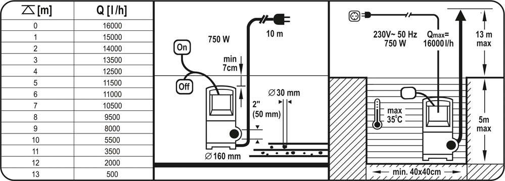 Pompa YATO YT- 85350 została wyposażona w mocny silnik o mocy 750W ze standardowym napięciem 230V. Maksymalna wydajność wynosi 1600 l/h, natomiast wysokość tłoczenia sięga 13 m. Pompa może być zanurzona na maksymalnie 5 metrów.