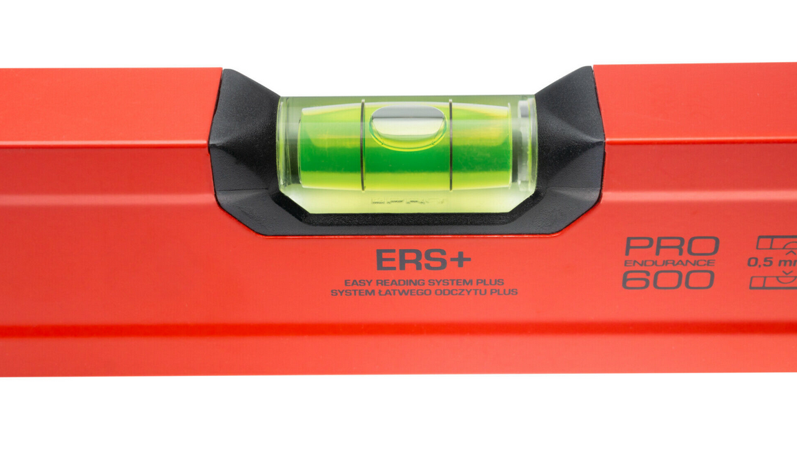 Poziomica PRO600 Pro 3-01-01-A1-100 to precyzyjne narzędzie do wykonywania pomiaru poziomu lub pionu. Narzędzie 3-01-01-A1-100 wykonano z wytrzymałego lakierowanego na czerwono profilu aluminiowego o wysokiej twardości powierzchniowej z przetłoczeniem o długości 100 cm. Poziomica PRO600 Pro 3-01-01-A1-100 pozwala na pomiar z dokładnością ± 0,5 mm/m, a system budowy libelli ERS+ powiększający obraz ułatwia odczyt. Poziomica Pro 3-01-01-A1-100 wyposażona w dwie libelle oraz końcowe nasadki z wytrzymałego elastomeru (ANTI SHOCK CAP).
