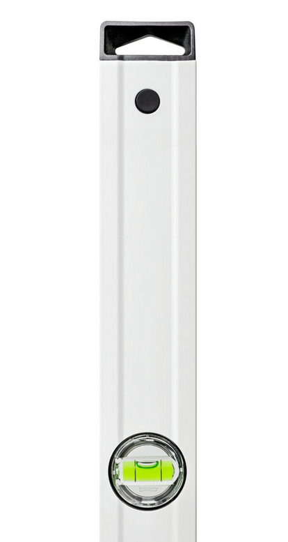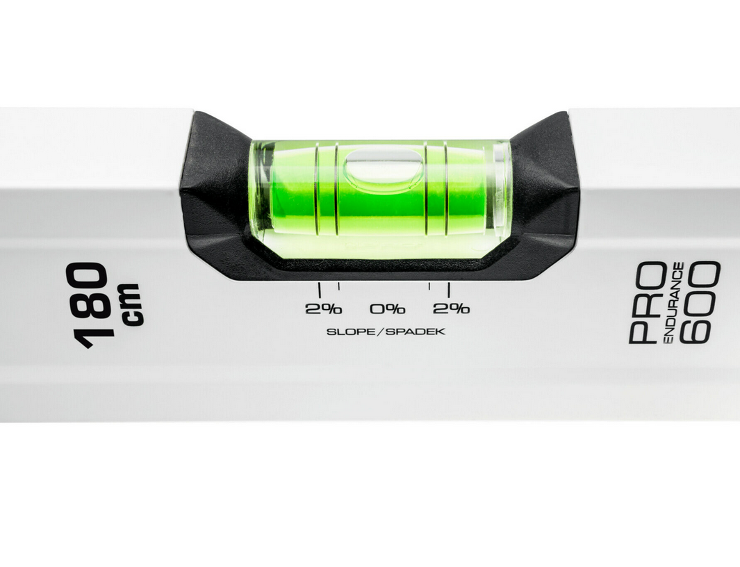 Poziomica aluminiowa PRO600 Pro 3-01-01-AB-180 to precyzyjne narzędzie do wykonywania pomiaru poziomu lub pionu. Narzędzie 3-01-01-AB-180 wykonano z wytrzymałego lakierowanego na biało profilu aluminiowego o wysokiej twardości powierzchniowej z przetłoczeniem o długości 180 cm. Poziomica PRO600 3-01-01-AB-180 pozwala na pomiar z dokładnością ± 0,5 mm/m, a system budowy libelli ERS+ powiększający obraz ułatwia odczyt. Poziomica 3-01-01-AB-180 wyposażona w dwie libelle, pierścienie dodatkowe umożliwiające wyznaczenie 2% spadku oraz końcowe nasadki z wytrzymałego elastomeru (ANTI SHOCK CAP).
