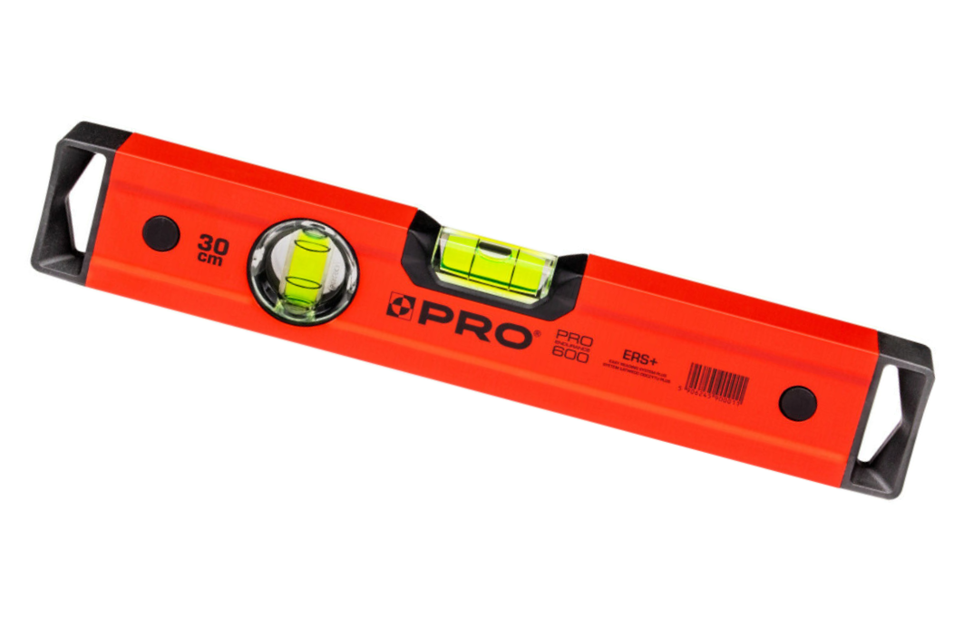 Poziomica PRO600 Pro 3-01-01-A1-030 to precyzyjne narzędzie do wykonywania pomiaru poziomu lub pionu. Narzędzie 3-01-01-A1-030 wykonano z wytrzymałego lakierowanego na czerwono profilu aluminiowego o wysokiej twardości powierzchniowej z przetłoczeniem o długości 30 cm. Poziomica PRO600 Pro 3-01-01-A1-030 pozwala na pomiar z dokładnością ± 0,5 mm/m, a system budowy libelli ERS+ powiększający obraz ułatwia odczyt. Poziomica Pro 3-01-01-A1-030 wyposażona w dwie libelle oraz końcowe nasadki z wytrzymałego elastomeru (ANTI SHOCK CAP).
