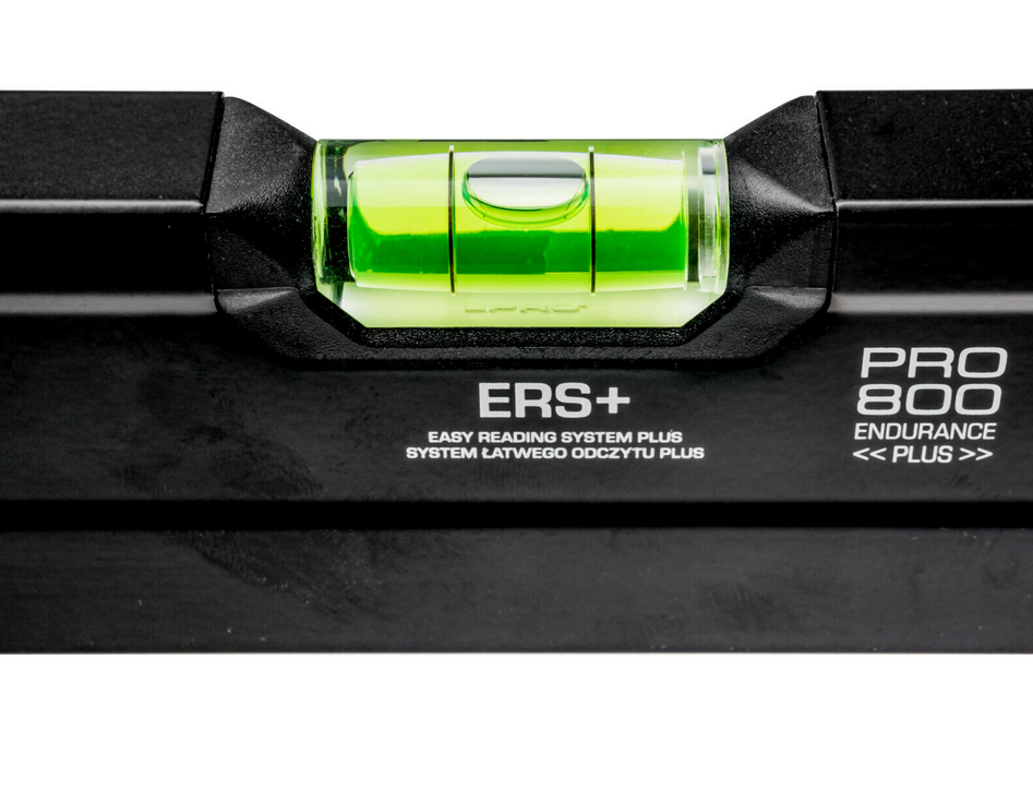 Poziomica PRO800 Pro 3-01-01-BG-050 to profesjonalne narzędzie do pomiaru poziomu lub pionu. Narzędzie 3-01-01-BG-050 wykonano z wytrzymałego dwukomorowego profilu aluminiowego lakierowanego na czarno o wysokiej twardości powierzchniowej z przetłoczeniem o długości 50 cm. Poziomica profesjonalna PRO800 Pro 3-01-01-BG-050 pozwala na pomiar z dokładnością ± 0,5 mm/m, a system budowy libelli ERS+ powiększający obraz ułatwia odczyt. Poziomica Pro 3-01-01-BG-050 wyposażona w dwie libelle wykonane z wysokiej jakości szkła akrylowego, poziomą umożliwiającą odczyt w położeniu normalnym i odwrotnym oraz pionowe, frezowaną powierzchnię pomiarową, a także końcowe nasadki z wytrzymałego elastomeru (ANTI SHOCK CAP).