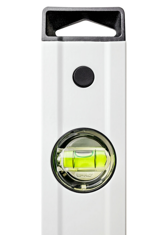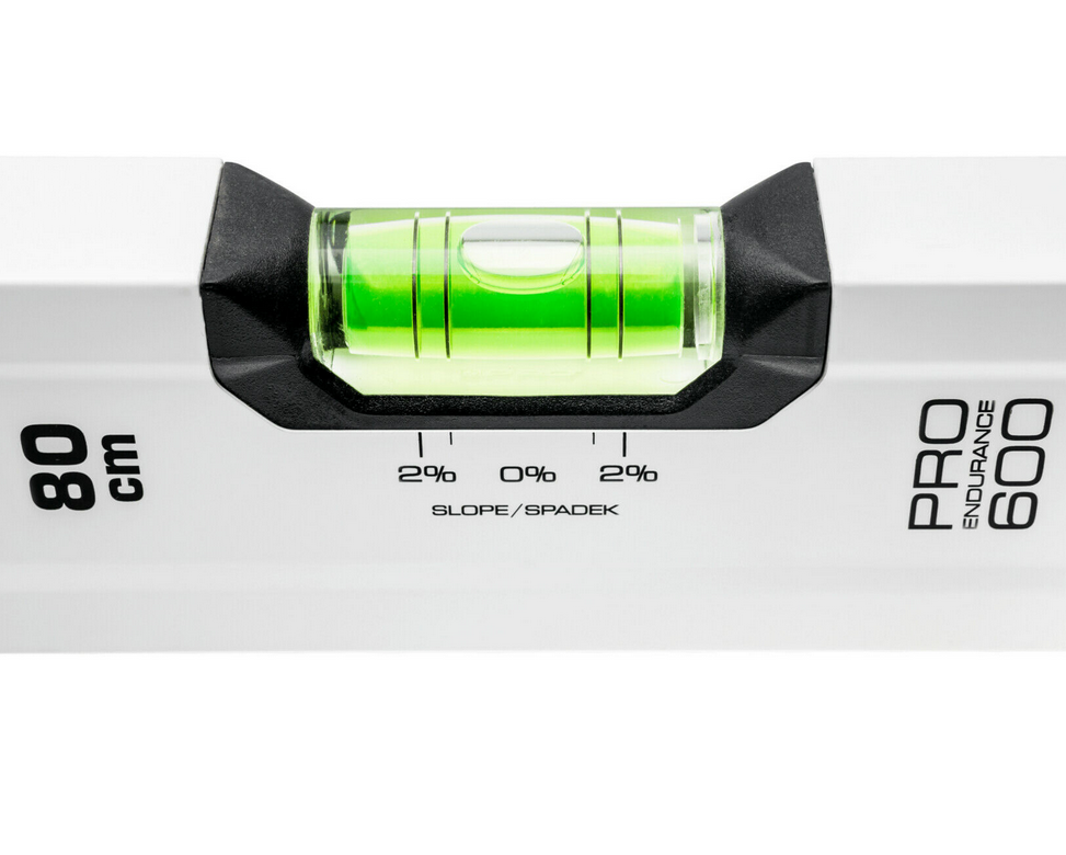 Poziomica aluminiowa PRO600 Pro 3-01-01-AB-080 to precyzyjne narzędzie do wykonywania pomiaru poziomu lub pionu. Narzędzie 3-01-01-AB-080 wykonano z wytrzymałego lakierowanego na biało profilu aluminiowego o wysokiej twardości powierzchniowej z przetłoczeniem o długości 80 cm. Poziomica PRO600 3-01-01-AB-080 pozwala na pomiar z dokładnością ± 0,5 mm/m, a system budowy libelli ERS+ powiększający obraz ułatwia odczyt. Poziomica 3-01-01-AB-080 wyposażona w dwie libelle, pierścienie dodatkowe umożliwiające wyznaczenie 2% spadku oraz końcowe nasadki z wytrzymałego elastomeru (ANTI SHOCK CAP).