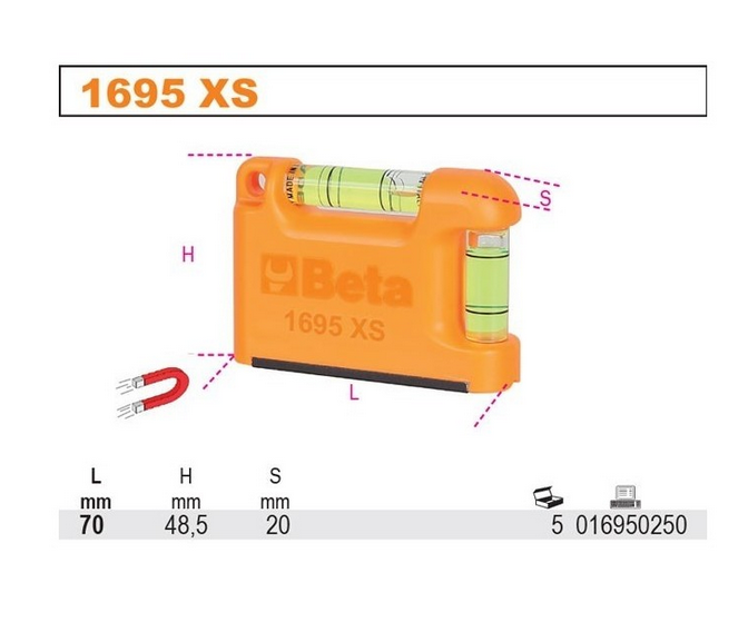 Poziomica kieszonkowa z magnesem Beta 1695XS  to narzędzie do pomiaru poziomu, pionu. Narzędzie 1695XS posiada długość 7 cm i zostało wykonane z wytrzymałego tworzywa sztucznego. Poziomica kieszonkowa Beta 1695XS posiada wbudowaną magnetyczną podstawę ułatwiającą montaż na materiałach ferromagnetycznych, co co zwiększa precyzję pomiaru i wygodę pracy. Dodatkowo poziomica Beta 1695XS wyposażona w dwie nietłukące się libelle do pomiaru poziomu i pionu.