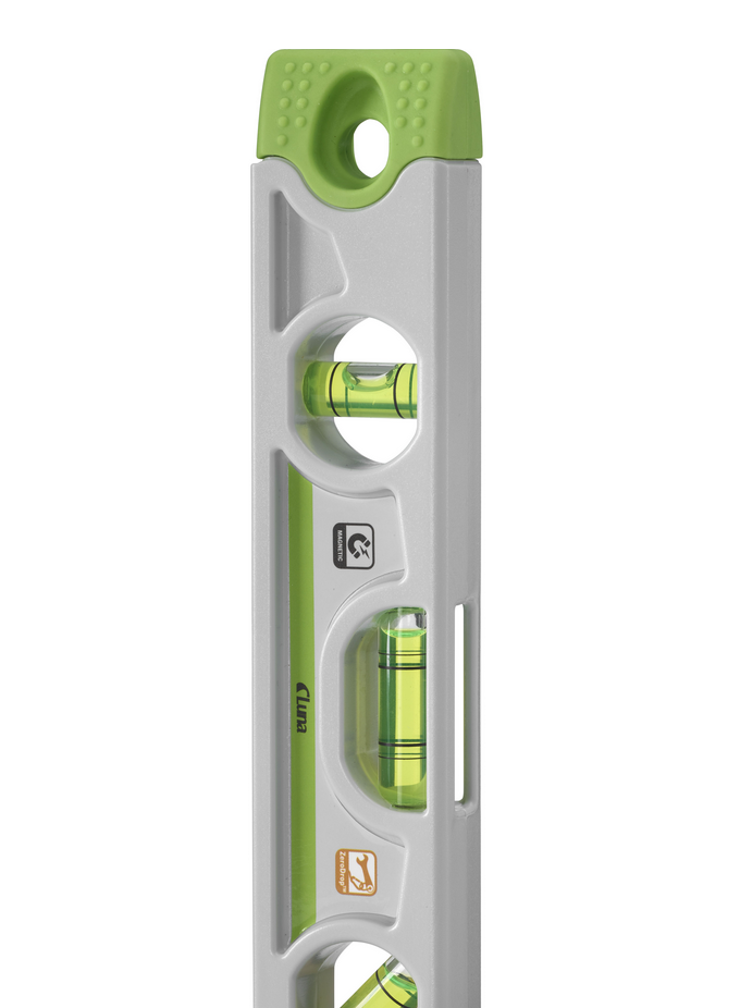 Poziomnica czółenkowa Luna 282940105 to narzędzie do pomiaru poziomu, pionu i skosu pod kątem 45°. Poziomica została wykonana z tworzywa sztucznego ABS, w którym wbudowano 3 libelle: pozioma, pionowa (z odblaskiem lustrzanym) i 45°. Poziomica Torpedo Luna 282940105 ma długość 23 cm. Spód narzędzia posiada rowek V oraz wbudowany magnes.
