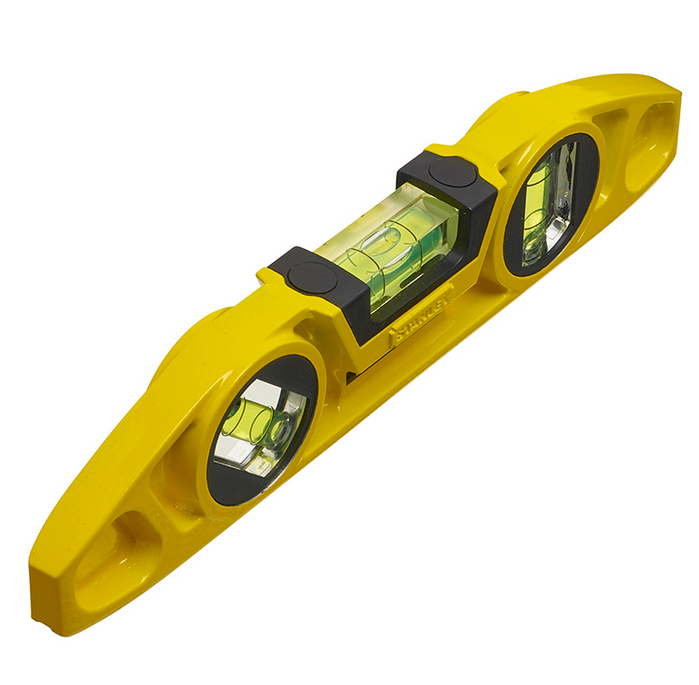 Poziomica czółenkowa Torpedo Level Stanley Fatmax 0-43-603 to narzędzie do pomiaru poziomu, pionu i skosu pod kątem 45°. Poziomica posiada odlewany korpus, w którym wbudowano 3 libelle: pozioma, pionowa i 45°. Poziomica Torpedo Level Stanley Fatmax 0-43-60 ma długość 22 cm. Spód narzędzia posiada rowek V do pomiaru na zaokrąglonych powierzchniach oraz wbudowany magnes.