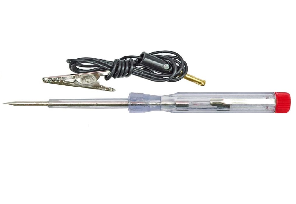 Samochodowy próbnik napięcia wyposażony w diodę LED. Zakres pomiarowy od 6 V do 12 V. Długość kabla 90 cm.