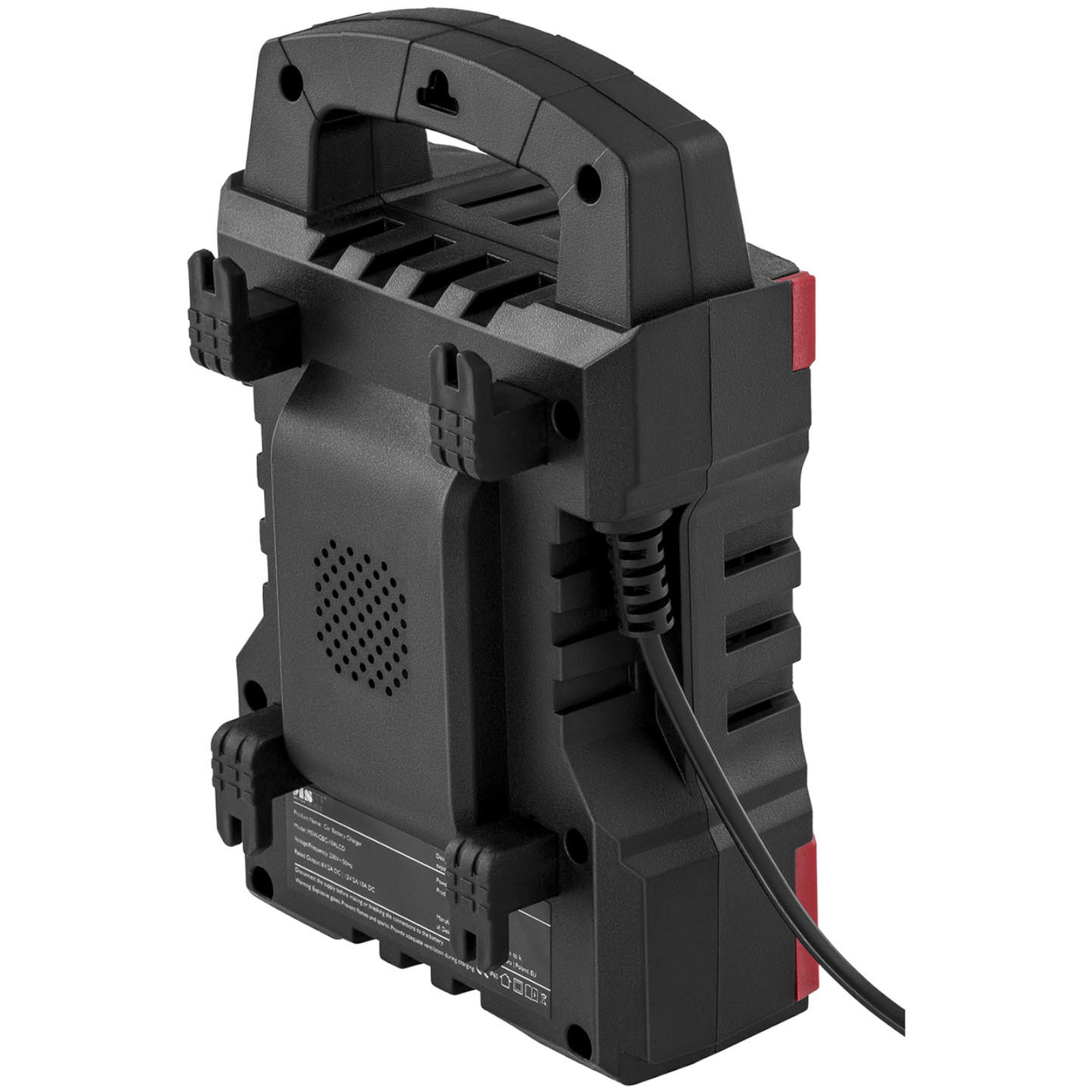 Prostownik samochodowy posiada cztery trybu ładowania: 6V, 12 V, szybkie ładowanie oraz tryb zimowy. W każdym z nich ładowarka wytwarza prąd ładowania 2 A lub 10 A dla akumulatorów o pojemności do 200 Ah. Urządzenie analizuje stan i rodzaj podłączonego akumulatora i automatycznie uruchamia optymalny tryb (6 V lub 12 V). Czerwony zacisk podłączany jest do dodatniego bieguna, czarny zacisk do ujemnego. Sterowanie mikroprocesorowe następuje samoistnie i monitoruje 8-stopniowy cykl ładowania. Funkcja pamięci zapisuje ostatni tryb oszczędzając czas przy kolejnym ładowaniu. Przy napięciu wyjściowym 6 V wytwarzany jest prąd ładowania 2 A, przy 12 V prąd 10 A. Urządzenie posiada panel sterowania z przełącznikiem trybu ładowania. Na podświetlanym wyświetlaczu o wymiarach 33 x 19 mm można z łatwością odczytać podane informacje. Urządzenie posiada zabezpieczenia przeciwzwarciowe, nadprądowe oraz przed odwrotną polaryzacją a także pracuje beziskrowo. Prostownik wyposażony został w 4 uchwyty na kable.