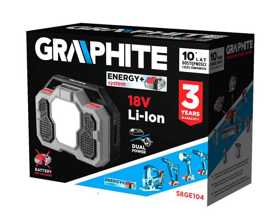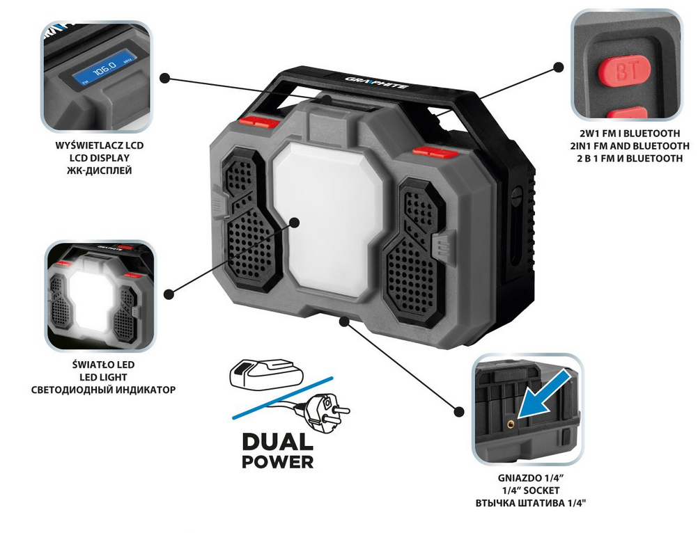 Radio budowlane Graphite 58GE104 to solidne i wszechstronne urządzenie, które sprawdzi się doskonale na placu budowy, w warsztacie czy w garażu. Dzięki swojej niezawodnej konstrukcji i wielu funkcjom zapewnia wygodę użytkowania oraz wysoką jakość dźwięku.