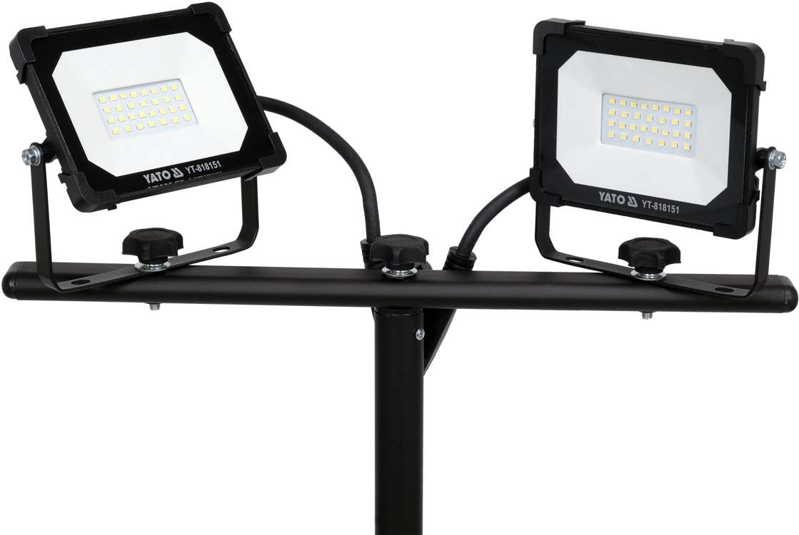 Dwa płaskie naświetlacze z wydajnymi diodami SMD LED umieszczone na stabilnym, regulowanym stojaku. Klasa szczelności IP65 pozwala na korzystanie z oświetlenia w warunkach zewnętrznych.