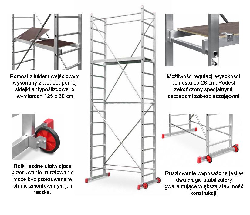 - niewielkie wymiary transportowe (możliwość przewożenia nawet na bagażniku dachowym), niewielka waga rusztowania
