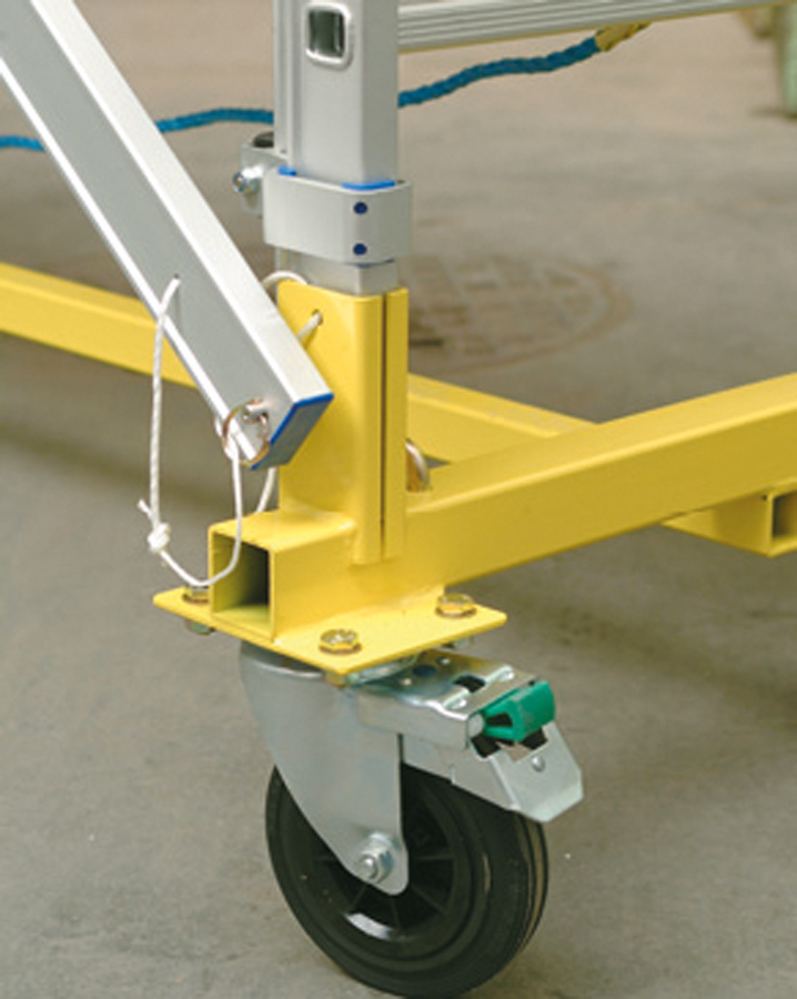 Wygodne przemieszczanie rusztowania dzięki zastosowaniu mocnego stalowego wózka jezdnego wyposażonego w nożne hamulce krętlika obrotu koła.