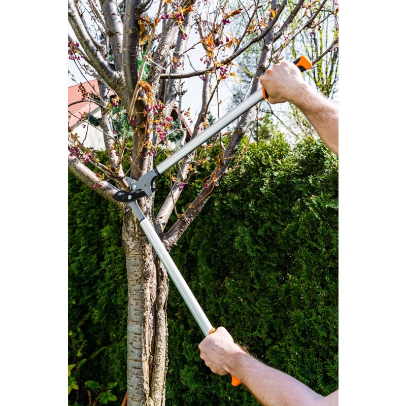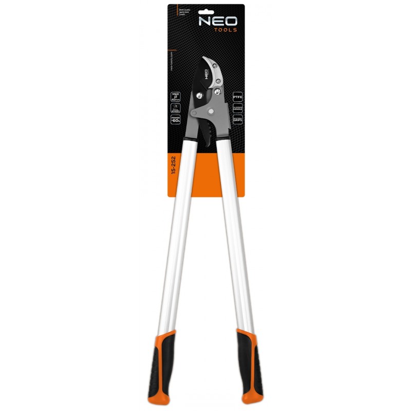 Kowadełkowy sekator do gałęzi 765 mm, zakres do 40 mm, przekładnia zwiększająca siłę nacisku o 60% 15-252 marki NEO to profesjonalne narzędzie do pracy w ogrodzie z wyżej umiejscowionymi roślinami, bez potrzeby używania drabiny.