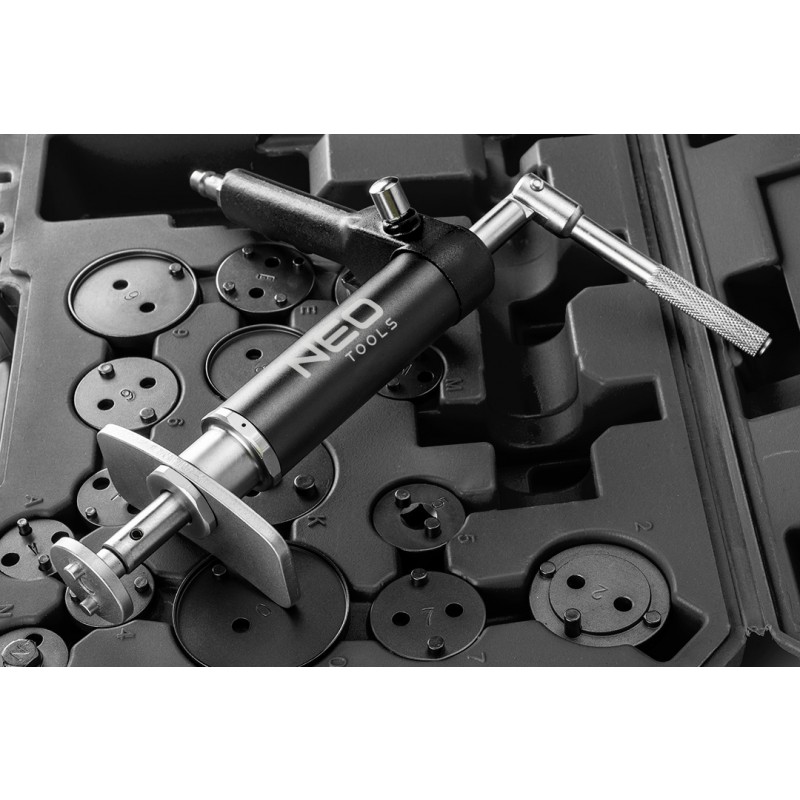 Separator pneumatyczny NEO (nr ref. 11-132) z końcówkami do zacisków hamulcowych z siłownikiem pneumatycznym. Pozwala na rozpieranie wciskanych i wkręcanych tłoczków hamulcowych. Pneumatyczny siłownik skraca do minimum czas pracy rozpierając zapieczone tłoczki. W zestawie 15 adapterów umożliwiających obsłużenie różnych rozmiarów i konstrukcji zacisków hamulcowych. Dostosowany do samochodów różnych marek.