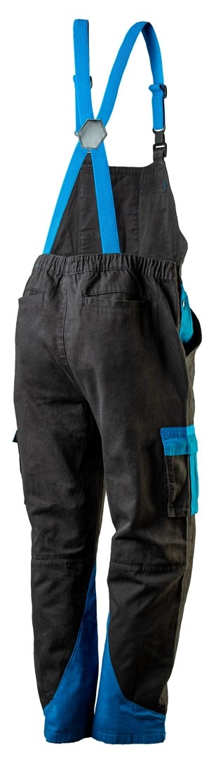 Elastyczne szelki z regulacją oraz guma w tylnej części pasa pozwalają na dopasowanie ogrodniczek do sylwetki, jednocześnie zapewniając komfort w pracy.