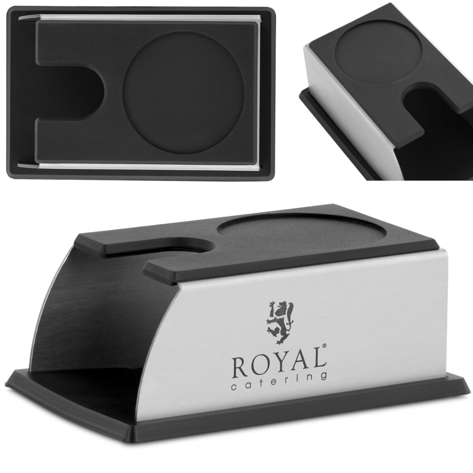 Stacja tampingowa marki Royal Catering sprawdzi się w każdym barze, kawiarni czy restauracji. Posiada zagłębienia na tamper i portafilter. Silikonowe części pozwalają na stabilność urządzenia. Baza wykonana została ze stali nierdzewnej oraz silikonu, jest łatwa w czyszczeniu i posiada atrakcyjny wygląd.