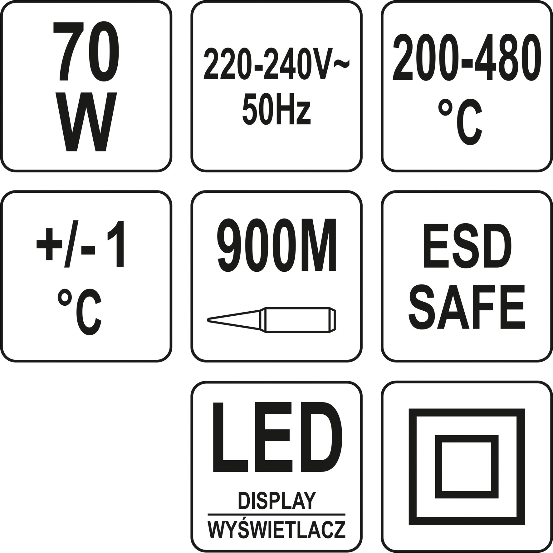 Stacja lutownicza YT-82459 z cyfrowym wyświetlaczem LED, regulacją temperatury oraz wieloma funkcjami ułatwiającymi wykonywanie prawidłowych połączeń lutowniczych. Stacja obsługuje kolbę lutowniczą 908D przystosowaną do bardzo popularnych wymiennych grotów z serii 900M.