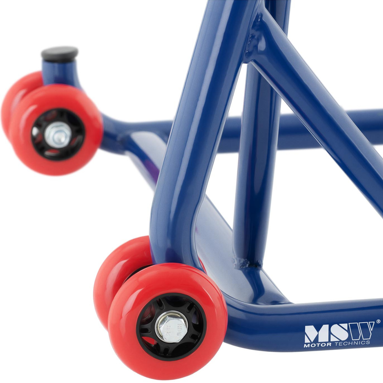 Jednostronny stojak motocyklowy marki MSW pozwoli stabilnie i wygodnie podnieść tylne koło jednośladu. Dzięki temu można szybko wymienić oponę, naprawić hamulce czy uniknąć powstawania płaskich miejsc na kole. Podnośnik do motocykla posiada wygodną obsługę podpory, z którą poradzi sobie jedna osoba. Wystarczy przymocować trzpień po lewej stronie tylnego koła pojazdu, a następnie nacisnąć uchwyt, który podniesie maszynę. Dodatkowo stojak posiada 4 gumowe kółka, ułatwiające obsługę. Duża wytrzymałość na obciążenia to zasługa solidnej konstrukcji stojaka motocyklowego. Wykonano go bowiem ze stali węglowej. Ponadto zastosowany trzpień o średnicy 27 mm pasuje do różnych motocykli.