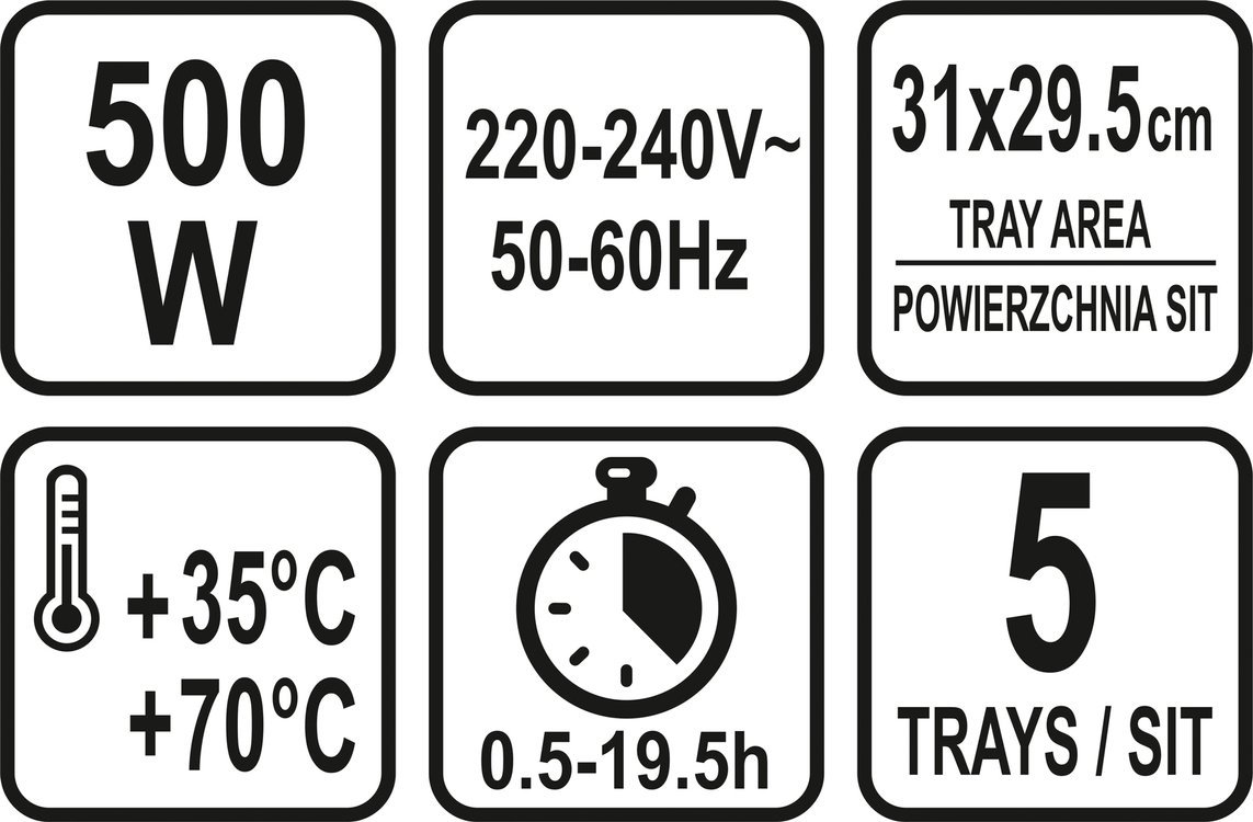 maksymalny rozmiar urządzenia dla 5 sit: 34 x 31 x 32 cm (długość x szerokość x wysokość) - idealny do suszenia także większych produktów.