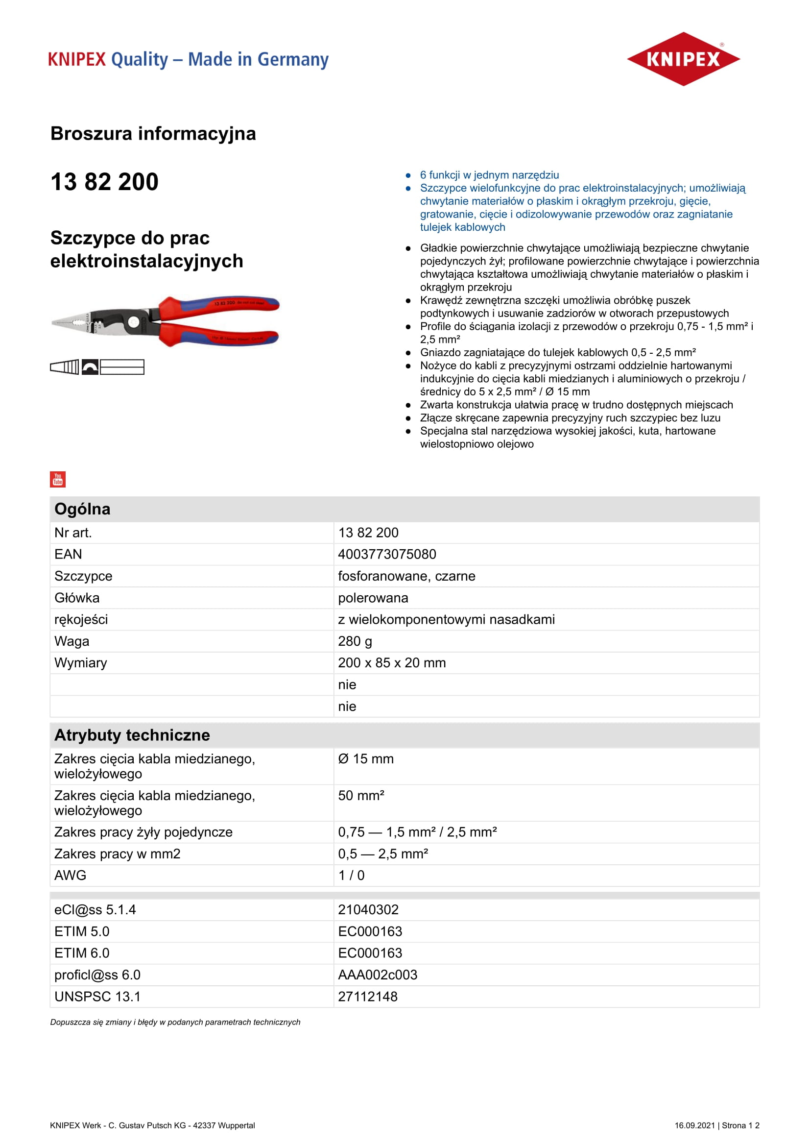 Nr art.: 13 82 200 EAN: 4003773075080 Szczypce: fosforanowane, czarne Główka: polerowana rękojeści: z wielokomponentowymi nasadkami Waga: 280 g Wymiary: 200 x 85 x 20 mm Zakres cięcia kabla miedzianego, wielożyłowego: 15 mm Zakres cięcia kabla miedzianego, wielożyłowego: 50 mm2 Zakres pracy żyły pojedyncze 0,75 — 1,5 mm2 / 2,5 mm2 Zakres pracy w mm2 0,5 — 2,5 mm2 AWG 1 / 0