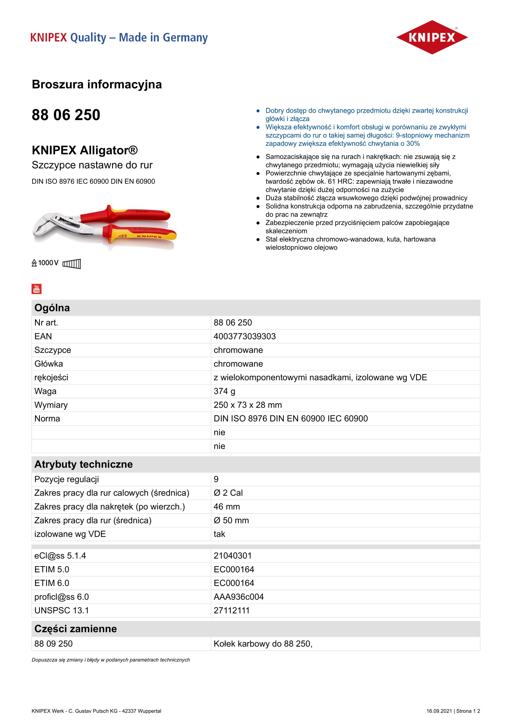 Nr art.: 88 06 250 EAN: 4003773039303 Szczypce: chromowane Główka: chromowane rękojeści: z wielokomponentowymi nasadkami, izolowane wg VDE Waga: 374 g Wymiary: 250 x 73 x 28 mm Norma: DIN ISO 8976 DIN EN 60900 IEC 60900 Pozycje regulacji: 9 Zakres pracy dla rur calowych (średnica): 2 Cal Zakres pracy dla nakrętek (po wierzch.): 46 mm Zakres pracy dla rur (średnica): 50 mm izolowane wg VDE: tak