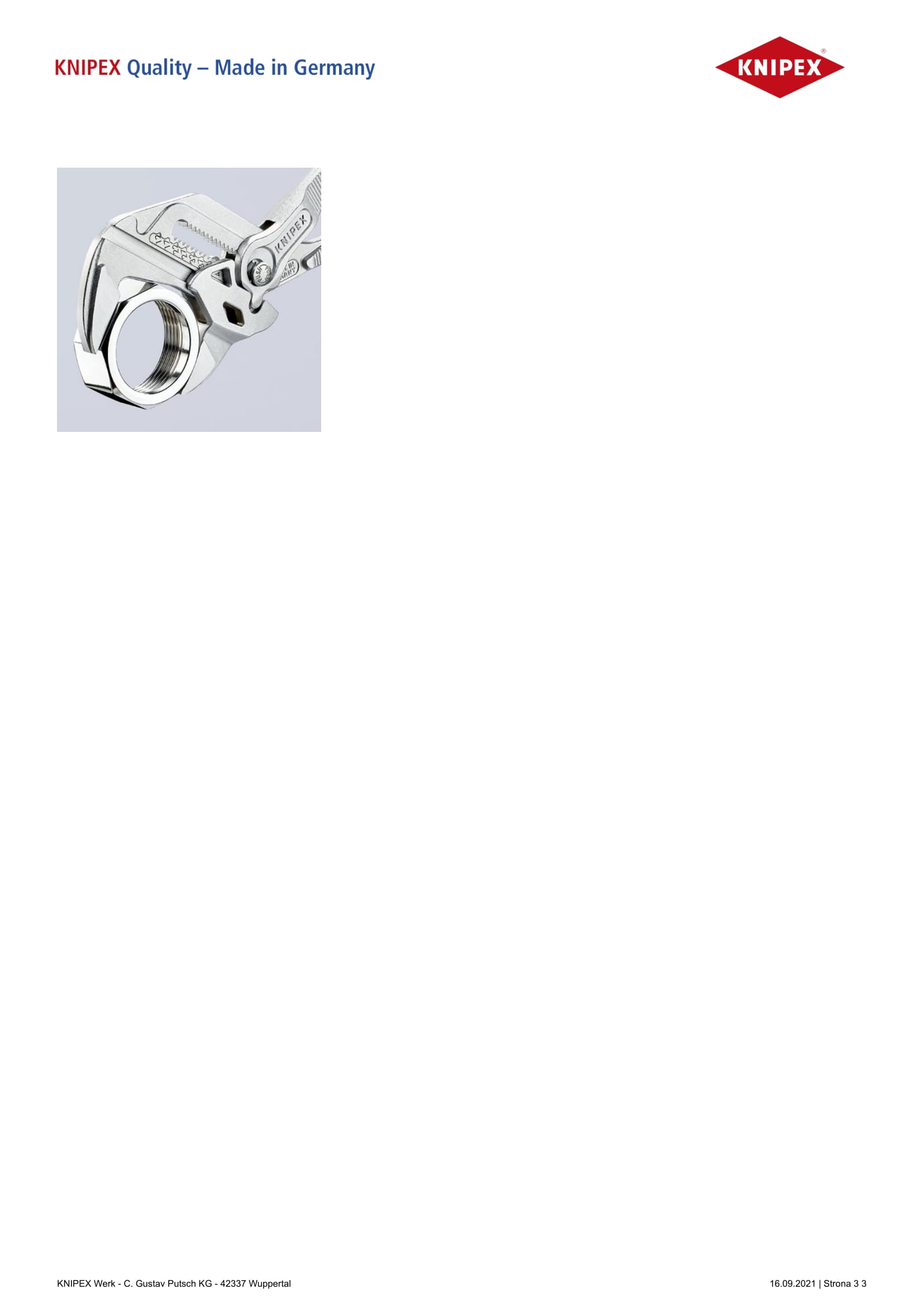 Zastępuje wieloczęściowy zestaw kluczy metrycznych i calowych Gładkie szczęki do instalacji elementów armatury o powierzchniach podatnych na uszkodzenia - pozwalają na bezpośredni montaż elementów chromowanych! Idealne do chwytania, trzymania, zaciskania i zaginania różnych przedmiotów Szczęki umożliwiają chwyt całą powierzchnią bez luzów, dzięki czemu nie następuje uszkodzenie krawędzi elementów armatury Szybka regulacja bezpośrednio na chwytanym przedmiocie za pomocą przycisku Bez ryzyka niezamierzonego przesunięcia się szczęk i zmiany ustawienia szerokości rozwarcia Równoległe szczęki pozwalają na bezstopniowe zaciskanie przedmiotów o dowolnych rozmiarach w podanym zakresie pracy Rozstaw szczęk pozwala na szybkie dokręcanie lub odkręcanie elementów złącznych w sposób zbliżony do tradycyjnego klucza z grzechotką Wysoka siła zacisku dzięki 10-krotnemu zwiększeniu siły ręki Stal elektryczna chromowo-wanadowa, kuta, hartowana olejowo