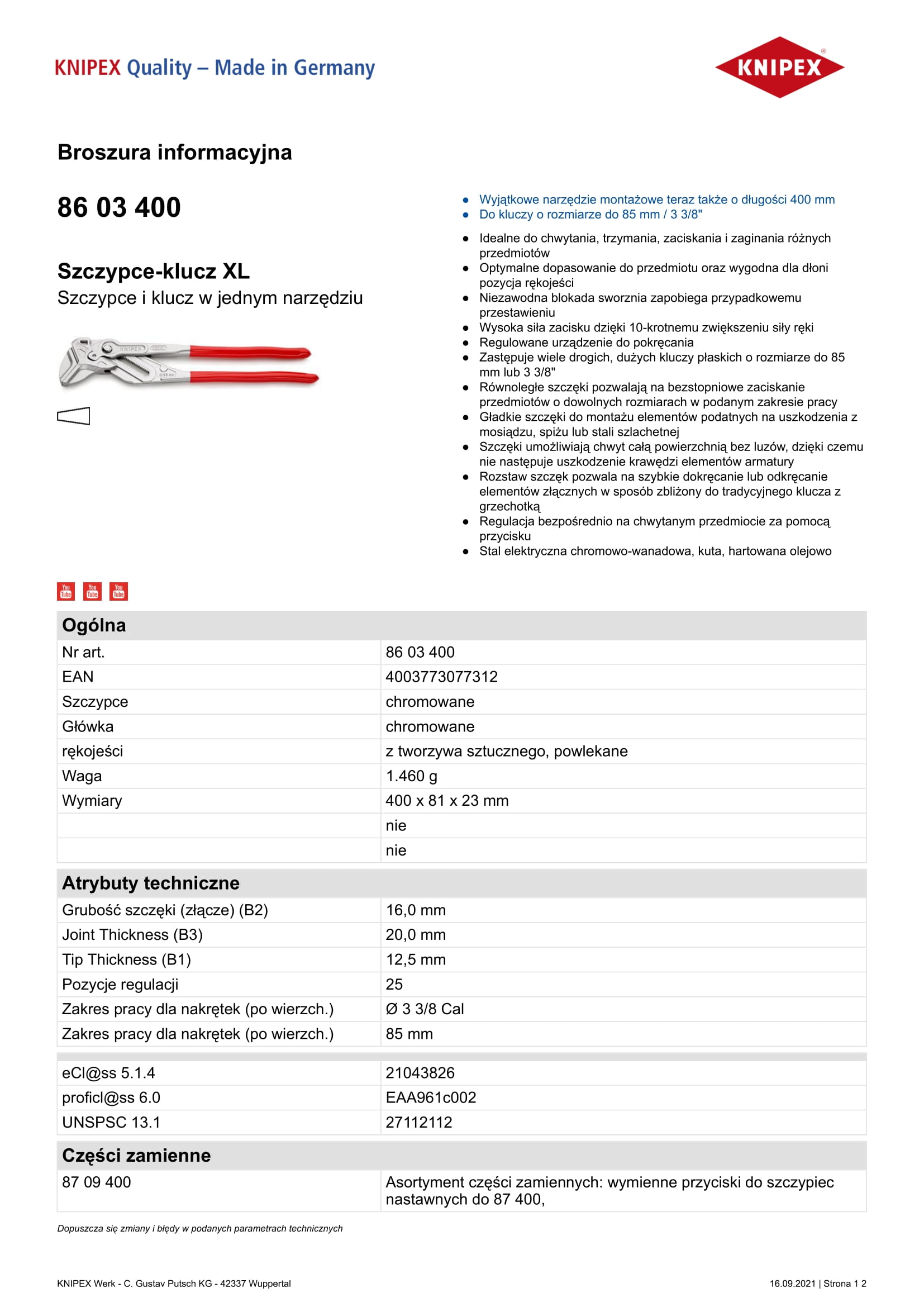 Nr art.: 86 03 400 EAN: 4003773077312 Szczypce: chromowane Główka: chromowane rękojeści: z tworzywa sztucznego, powlekane Waga: 1.460 g Wymiary: 400 x 81 x 23 mm Grubość szczęki (złącze) (B2): 16,0 mm Joint Thickness (B3): 20,0 mm Tip Thickness (B1): 12,5 mm Pozycje regulacji: 25 Zakres pracy dla nakrętek (po wierzch.): 3 3/8 Cal Zakres pracy dla nakrętek (po wierzch.): 85 mm