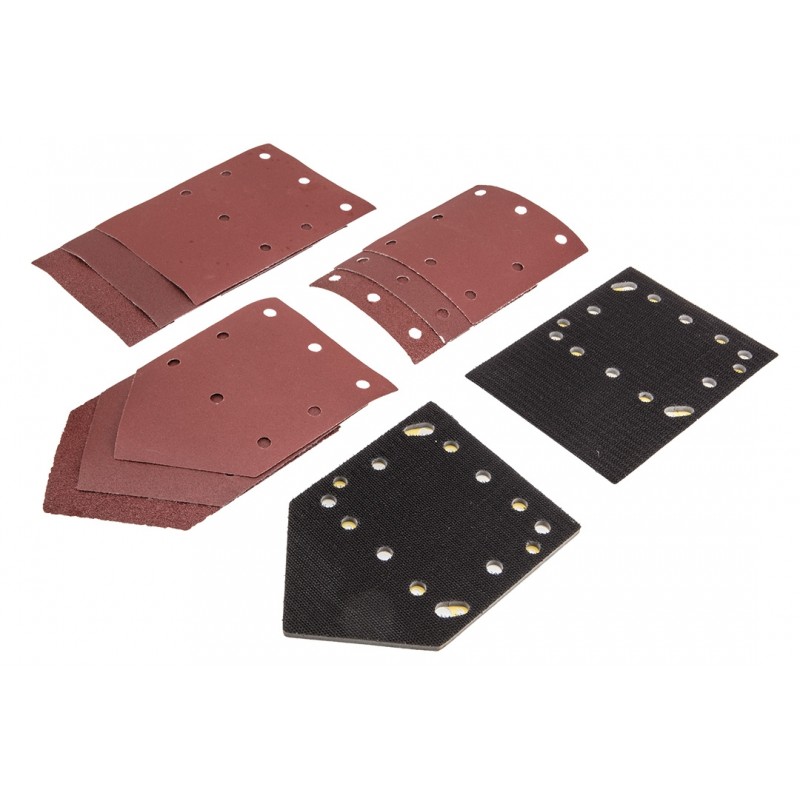W zestawie ze szlifierką oferowane są 3 stopy (kwadratowa, prostokątna i trójkątna), papiery ścierne (9 sztuk) oraz pojemnik na pył z filtrem.
