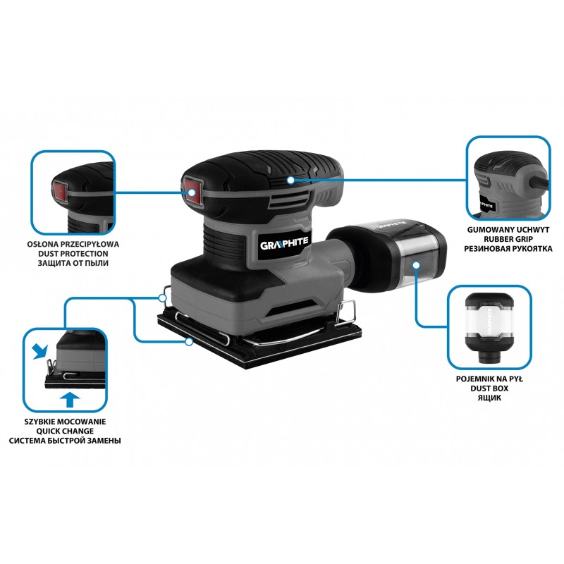 Szlifierka oscylacyjna 240 W, stopa 110 x 100 mm 59G322 marki GRAPHITE to narzędzie o mocy 240 W ze stopą 110 x 100 mm.