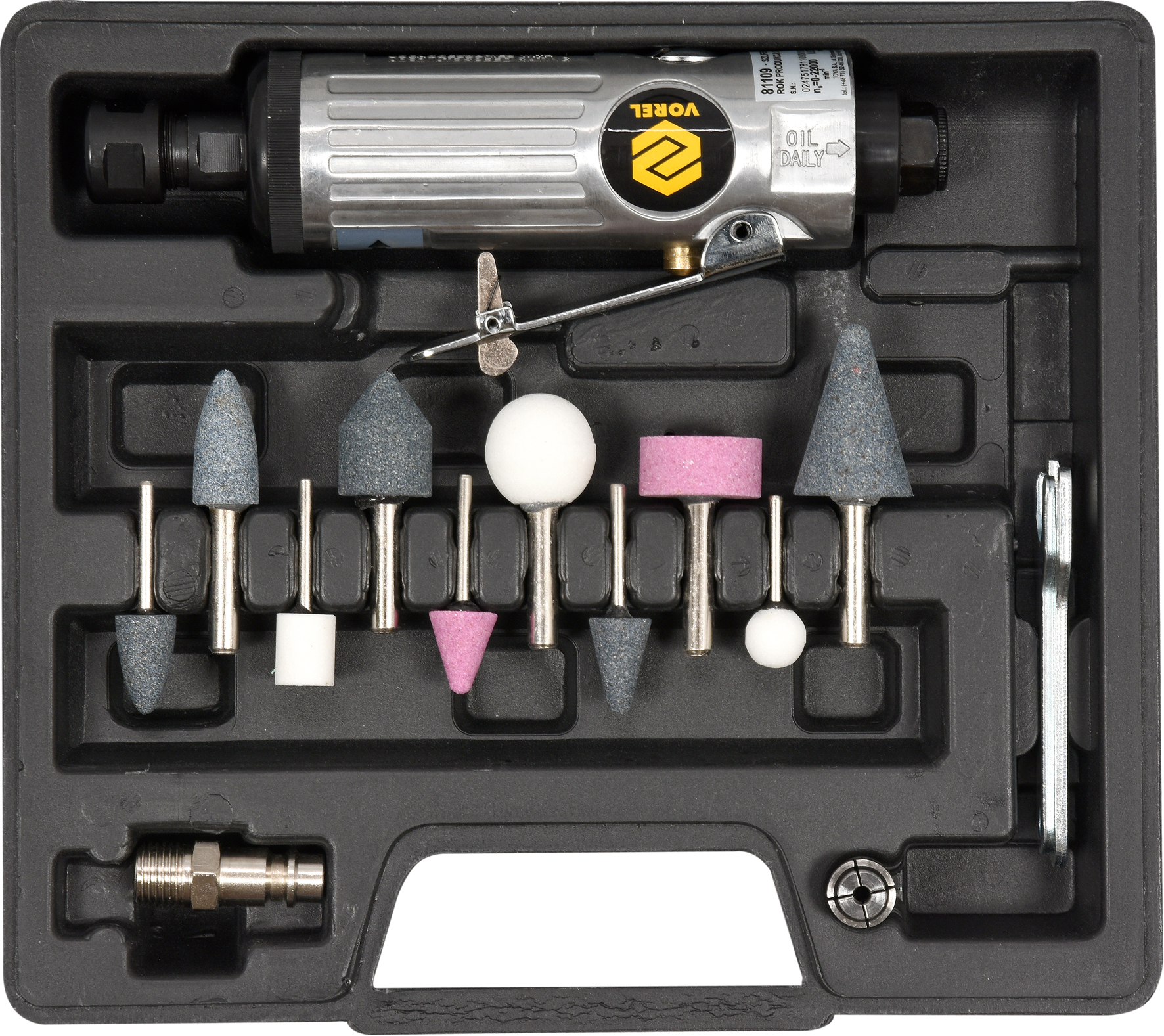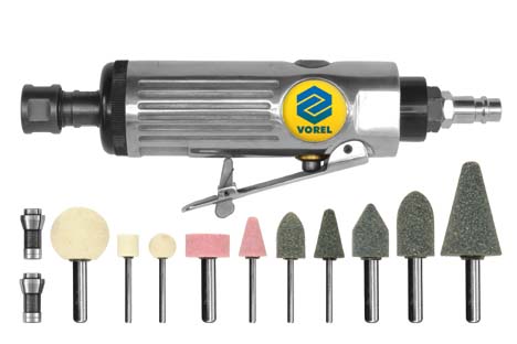 Szlifierka pneumatyczna prosta z akcesoriami, 10 części.