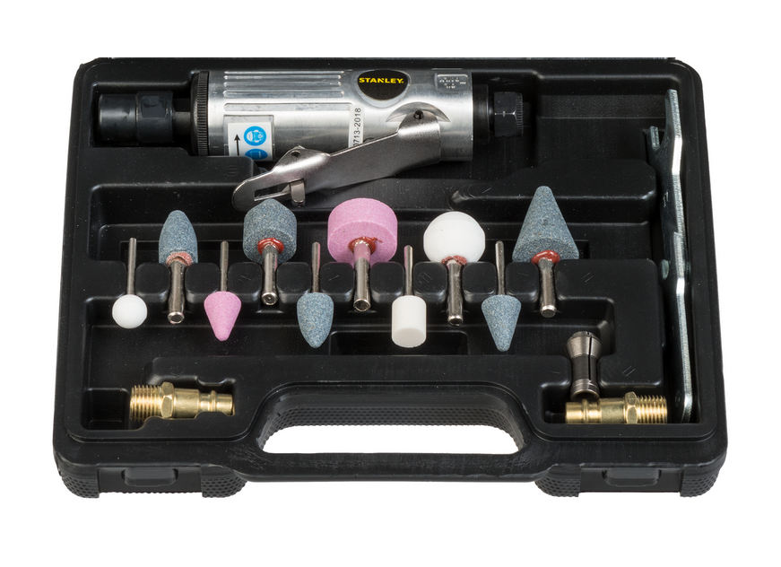 Szlifierka pneumatyczna prosta Stanley 160153XSTN jest narzędziem zasilanym strumieniem sprężonego powietrza przeznaczonym do szlifowania i cięcia metalu, drewna lub tworzyw sztucznych. Szlifierka prosta Stanley 160153XSTN wykorzystuje narzędzia trzpieniowe tnące i szlifujące o średnicy trzpienia 3 i 6 mm, które znajdują się w zestawie z narzędziem. Szlifierka Stanley 160153XSTN posiada szybkozłącze 1/4" do zasilania sprężonym powietrzem.