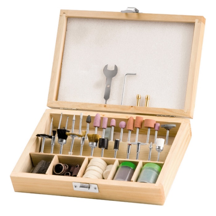 To kompaktowa wszechstronna szlifierka ze ściernicą i tarczą polerską. Dzięki możliwości podłączenia elastycznego wałka i regulacji prędkości nadaje się do szlifowania, polerowania, cięcia, czyszczenia oraz do najdrobniejszych i precyzyjnych prac. Cztery gumowe nóżki zapewniające stabilność przy niskim poziomie wibracji. Do zestawu dołączony jest komplet 100 akcesoriów w drewnianym pudełku.